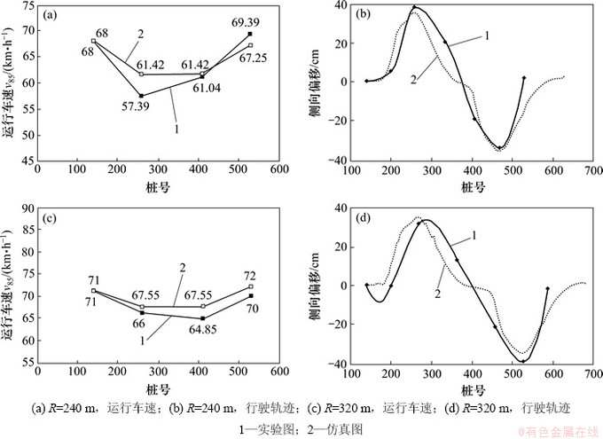 以标定的模型,对其余实验路段R=240 m和R=320 m进行仿真计算,仿真结果与实验特征值的对比如图11所示。