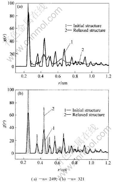图1所示为铜团簇的对偶分布函数。 由图1可见, 虽然n=249时铜团簇的初始结构为理想晶体, 但通过分子动力学演化, 很多峰消失, 最后的稳定结构为非晶态。 对于n=321的铜团簇, 从对偶分布函数来看, 初始结构是晶体, 通过分子动力学驰豫后, 峰位更尖锐, 说明其结构保持长程有序, 仍然是晶态。 通过对其它团簇的对偶分布函数研究表明, 原子数为19, 43, 55, 79, 87, 135, 141, 249及459的团簇为非晶态, 而原子数为177, 201, 225, 321, 369, 381, 429以及n≥531的团簇为晶态。 原子数为13的团簇只有一层原子, 可以认为是晶态, 也可以认为是非晶态。 分子动力学驰豫是为了找出团簇的最低能量。 因此, 团簇结构呈非晶态, 说明非晶态的自由能更低, 结构更稳定。 而团簇结构经驰豫后成晶态团簇, 说明结构为晶态, 且其能量更低。 这种结构的择优选择主要是由于纳米团簇有较大的比表面积, 较大的比表面积可以直接影响团簇结构性能。 但比表面积如何影响纳米团簇的结构则需进一步的研究。