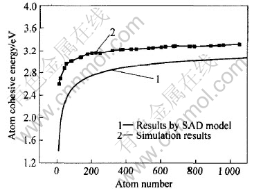 Fig.2 Relationship between cohesive energy and atom number of Cu nanoclusters[12, 13]