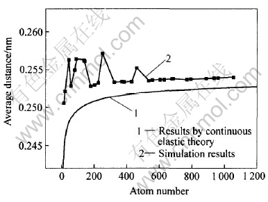 Fig.3 Relationship between average distance and atom number of Cu nanoclusters