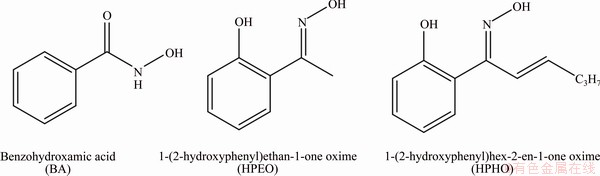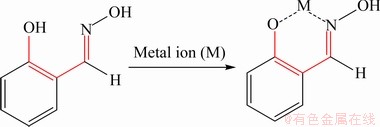 The C=N—OH group of oxime molecule has a long pair electron and is always recognized as an electron-donor for metal ion. And its corresponding oximes have been proved to be effective collectors for copper oxide ore because of their selective complexation with copper ions [10]. The model of Cu(II)-salicylaldoxime complex is proposed as six-membered ring structure according to Cecile’s work (see Scheme 1) [11]. Salicylaldoxime is a typical oxime collector widely studied in copper oxide ore, cassiterite and wolframite flotation [10-13].