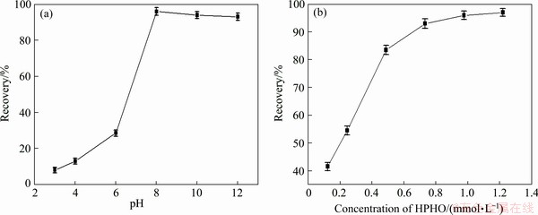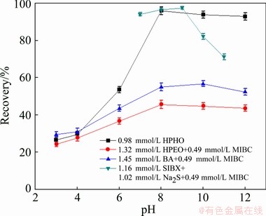 Micro-flotation tests were performed with HPHO, HPEO, BA and SIBX. Figure 2(a) shows flotation performance of malachite at different pH values and 0.98 mmol/L HPHO. This reveals that the recovery of malachite increases at varying pH from 3 to 8. When the pH of pulp is higher than 8, the recovery of malachite decreases insignificantly until pH around 11. At a pH of 8, 98.1% of malachite is floated out. Figure 2(b) presents flotation recovery of malachite at HPHO concentrations ranging from 0.15 to 1.22 mmol/L, which shows the recovery of malachite increases rapidly at varying concentration from of 0.15 to 0.39 mmol/L. When the collector concentration is more than 0.73 mmol/L, the recovery increases slowly.