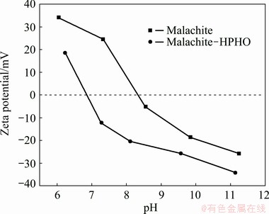 The zeta potential of malachite as a function of the pH value with or without HPHO treatment is shown in Fig. 4. The isoelectric point (IEP) of malachite stands at approximately pH 8.3 in 0.01 mol/L KNO3 solution, which is in agreement with our previous work [22]. The results indicate that the zeta potential of malachite generally decreases after being treated with HPHO. And IEP of malachite moves to 6.8.