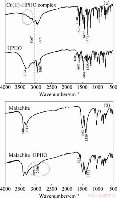 The FTIR results of malachite, HPHO, Cu(II)-HPHO complex and malachite before and after HPHO adsorption are shown in Fig. 5. The characteristic peaks of HPHO, which are related to —OH, C=N, benzene ring, —CH3 and —CH2— groups, are found in Fig. 5. The stretching vibration of —O—H is found at 3324 cm-1. The stretching vibration of C—H on benzene ring is traced at around 3067 cm-1. The vibration of —CH3 and —CH2— can be seen at 2971 and 2905 cm-1, respectively. The stretching vibration of benzene ring or C=C is detected at 1328, 1464 and 1605 cm-1. The stretching vibration of C=N stands at 1681 cm-1 [23]. As to Cu(II)-HPHO complex, the peaks around 3067 and 2971 cm-1 owe to C—H, —CH2— and —CH3 groups; the peaks at 1323, 1429 and 1595 cm-1 are related to benzene ring, C=C and C=N groups, respectively. It is clear that the peak around 3324 cm-1 is weakened after reaction. Peaks of C=N and —OH bonds move to low frequency(red shift) [24]. The characteristic peaks of malachite are detected around 1489, 1389, 3404 and 3313 cm-1. After HPHO interaction, the peaks around 1323, 1595, 2966 and 3092 cm-1 are traced on the malachite surface, which are similar to FTIR of Cu(II)-HPHO complex.
