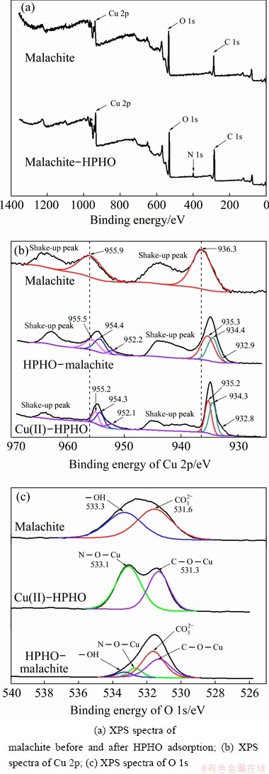 The XPS results of malachite, Cu(II)-HPHO complex and HPHO-malachite products are shown in Fig. 6. Figure 6(a) presents the survey scan of malachite before and after HPHO adsorption. It indicates that the peak of N 1s is found on malachite surface. The relative intensity of the peak of C 1s increases after HPHO treatment as well. In order to find more data for adsorption and reaction mechanism, high-resolution XPS spectra of Cu 2p and O 1s are presented in Figs. 6(b, c), respectively. The Cu 2p3/2 and Cu 2p1/2 XPS peaks of malachite are found at around 936.3 and 955.9 eV, respectively. The shake-up peaks of Cu(II) species are traced at around 938 to 946 eV and 960 to 967 eV [22]. The Cu 2p3/2 and Cu 2p1/2 XPS peaks of Cu(II)-HPHO complex are detected at around 932.8, 934.3, 935.2, 952.1, 954.3 and 955.2 eV. Cu 2p3/2 and 2p1/2 peaks of HPHO-malachite prodcuts are observed around 932.9, 934.4, 935.3, 952.2, 954.4 and 955.5 eV. As for O 1s, the results in Fig. 6(c) illustrate the O 1s XPS peaks of malachite are made up of two components, 531.6 eV for CO32-, and 533.3 eV for —OH. After HPHO adsorption, the peak at around 533.3 eV is weakened. And the XPS peaks for C—O—Cu and N—O—Cu bonds are found at 531.3 and 533.1 eV.