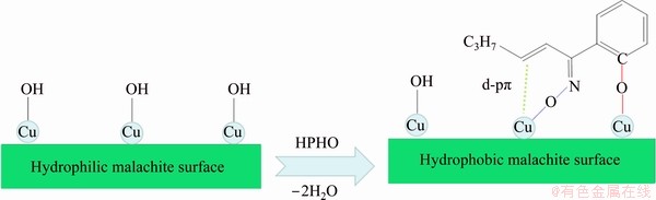 Based on previous results and discussion, a schematic model of HPHO adsorption on a malachite surface is shown in Fig. 8. It is demonstrated that the Cu species are bound with O atoms in the —OH and C=N—OH groups, and d-pπ might be formed between Cu and C=C group. As a strong adsorption of HPHO though double conjugate structure assistance, the modified malachite is easily floated out in pulp.