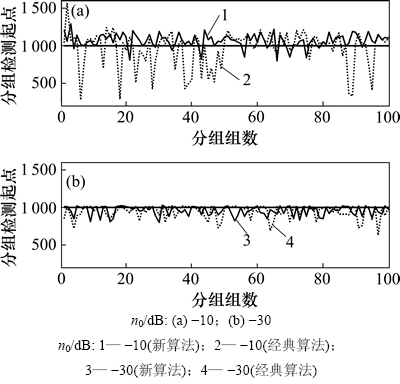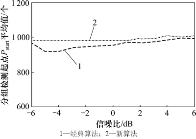 其中:Dv为检测值;Rv为真值。在-10 dB时,新算法的均方误差为14.55,而经典算法为43.34,经典算法的均方误差比新算法的均方误差高3倍多;在-30 dB时,新算法的均方误差为6.73,而经典算法的为21.93,同样经典算法的均方误差比新算法的均方误差也高3倍多:所以,在相同的电力噪声功率下,新算法的均方误差比经典算法的均方误差小很多,这说明新算法对数据分组起点的检测比经典算法的检测准确性高。