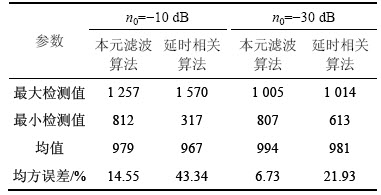 图3所示为n0为-30 dB和-10 dB条件下经典算法和新算法的分组检测起点,其中黑色实线代表真实的数据分组起点,即Pstart=1 000,实线代表新算法所检测起点值,虚线代表经典算法所检测起点值。从图6可以看出:在-10 dB电力环境中,新算法的检测结果的最大检测值为1 257,最小检测值为812;而经典算法的最大检测值为1 570,最小检测值为317,均比新算法的检测结果距离真值较大。所以,新算法与经典算法相比,其检测结果更加收敛于真实分组起点Pstart。这是因为经典算法根据延迟相关的能量变化来检测分组的起点,并设置判决门限,所以,在电力噪声比较低的情况下,其判决误差较大,结果较发散;而新算法利用本元分解及空间能量跟踪滤波的方法来检测数据分组的起点,提高了算法检测的准确性。同时,从图6中可知-30 dB电力噪声功率下的检测结果比-10 dB的检测结果收敛,这同样说明了新算法对不同干扰环境的适应性。