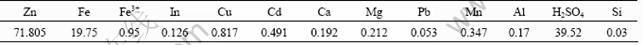 Zinc-oxide calcine reduction lixivium was used as raw solution, and its chemical composition is listed in Table 1. It is shown that the main constituents of raw solution are Zn, Fe and H2SO4. Concomitant valuable metals, such as In, Cu and Cd, should be recovered in consideration of economic benefit. Some harmful impurities like Ca, Mg, Al or Si, which have negative influence on the magnetic properties of soft magnetic ferrite material, must be completely removed from pregnant solution before ferric oxide powder preparation.