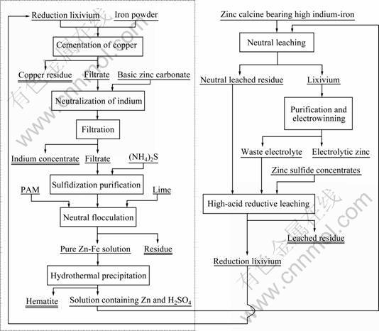 The principle flow sheet for extracting indium and preparing ferric oxide is illustrated in Fig.1. Reduction lixivium from high-acid reductive leaching of zinc oxide calcine bearing high In-Fe was used as raw solution. After copper cementation and indium neutralization, some harmful impurities were deeply removed by sulfidization purification and neutral flocculation. And then, Zn-Fe separation and sulfuric acid regeneration were achieved with thermal precipitation method. Simultaneously, ferric oxide powder for soft magnetic ferrite material was prepared.