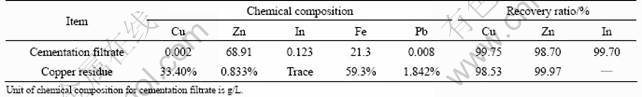 In order to recover valuable metal and conduct deep reduction of Fe3+ ion in pregnant solution, cementation of copper by iron powder was carried out at 55 °C for 1 h with iron power dosage equal to 2.1 times of theoretical consumption. The experimental results are shown in Table 2. It is indicated that cementation ratio of Cu is about 99%, and the grade of obtained copper residue is higher than 33%. Calculated by post-reaction filtrate, the loss ratios of Zn and In are 1.3% and 0.3%, respectively.