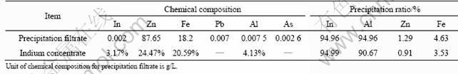 As shown in Table 3, the precipitation ratio of In is about 95%, and the grade of obtained indium concentrate is higher than 3%. During indium neutralization, most aluminum is precipitated into indium concentrate, and the loss ratios of Fe and Zn calculated by filtrate are 4.63% and 1.29%, respectively. The contents of Zn, Fe, Al in obtained indium concentrate are 24.47%, 20.59% and 4.13%, respectively.