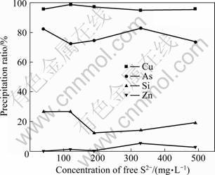 Fig.2 Effect of free S2- concentration on precipitation ratio of impurities