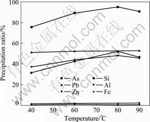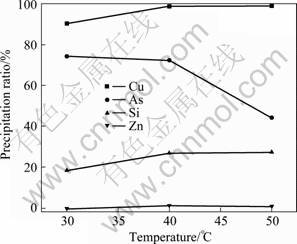 It is demonstrated in Fig.3 that the precipitation ratios of Cu, Si and Zn are gradually enhanced with increasing the temperature, but that of As is quickly decreased on the contrary. Considering all, 40 °C is the optimal temperature. The precipitation ratios of Cu, As, Zn and Si are 98.8%, 72.4%, 1% and 26.6%, respectively.