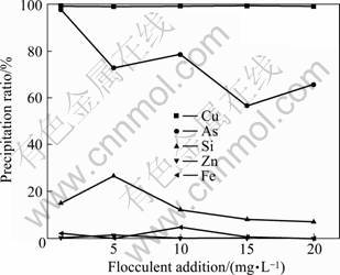 As shown in Fig.4, the precipitation ratios of As and Si decline with the increase of flocculent concentration. In contrast, it has slight influence on the precipitation ratios of Cu and Zn. It is because that flocculent provides the backbone for Fe(OH)3, and Fe(OH)3 can adsorb Si [21]. Overall, 5 mg/L is the optimal flocculent concentration with larger precipitation ratios of Cu, As, Si and lower precipitation ratios of Zn and Fe.