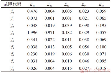 对S700K转辙机正常动作功率曲线f0及各种故障功率曲线进行EEMD分解,提取前9个IMF分量的样本熵Es作为故障诊断特征参数。设定原始数据长度N=700,模式维数m=2,相似容限参数γ=0.2σ。本文仅展示每种故障信号前5个IMF分量,如表1所示。
