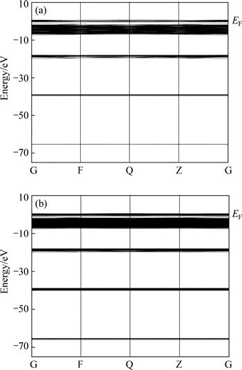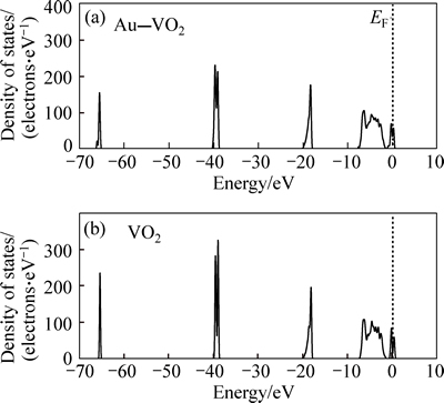 Figure 3 show the band structures of VO2 (Fig. 3(a)) and Au–VO2 (Fig. 3(b)). Band gaps of VO2 and Au–VO2 are found to be 0.115 eV and 0.013 eV, respectively, which are smaller than the theoretical value (0.7 eV) [24]. Smaller band gap values are caused by DFT in GGA functional, which is insufficient to process inter-electron exchange interaction and does not affect the analysis of energy gap results [25]. However, the band gap of VO2 after doping with Au becomes smaller. TIAN et al [26] reported that the band gap of VO2 after W doping decreased from 1.103 eV to 0.643 eV. REN et al [20] reported that the band gap of VO2 after F doping also decreased. The smaller band gap suggests that the doped VO2 has a higher metallicity.