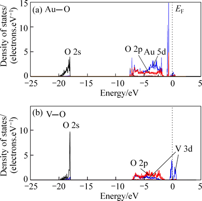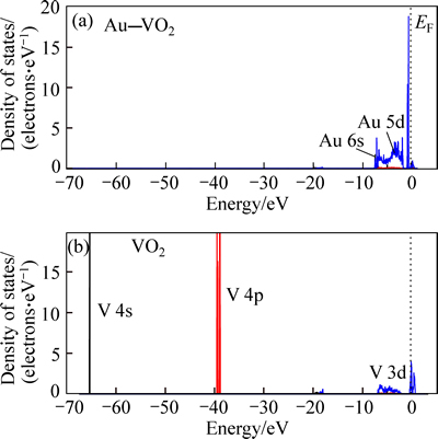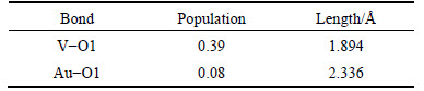Table 1 shows Mulliken bond population values of O—V bond (VO2) and Au—O bond (Au-VO2). It is very clear that the population values of Au—O bond is much smaller than that of V—O bond, which shows that covalent bond between Au and O is weaker than that between O and V. According to Fig. 6, the interaction between O and Au is stronger than that between O and V, indicating that O—Au contains the stronger ionic bond.