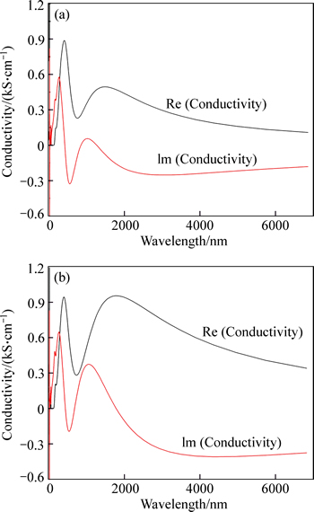 Figure 8 shows the conductivities of VO2 and Au–VO2. It is very obvious that the conductivity of Au–VO2 is larger than that of VO2, especially those around 1000 nm (imaginary part). The conductivity of polarization current σp and the dielectric function ε(ω) are related through Eq. (3):