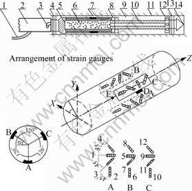 Fig.1 Structure of improved hollow inclusion cell: 1—Strain cell cable; 2—Erection lever; 3—Joint pin; 4—Back-end seal ring; 5—Ethoxyline resin; 6—Cavity; 7—Resistance strain gauge; 8—Fixed pin; 9—Interval between strain gauge and wall of borehole; 10—Plunger; 11—Bore-hole on rock mass; 12—Pore for glue outflow; 13—Front-end seal ring; 14—Guide plug
