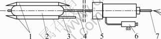 Fig.2 Structure of MC type bore-hole stress gauge: 1—Inclusion textures; 2—Pressure cushion; 3—Erection lever; 4—Oil pipe; 5—Pressure-frequency convertor; 6—Oil syringe; 7—Testing cable