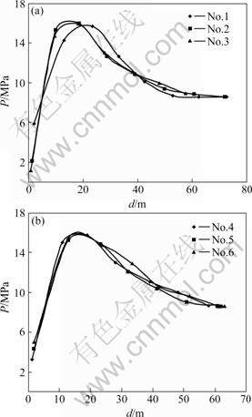 After installing borehole pressure gauges, the mining-induced stresses were measured every two weeks from 23 June, 2004 to 8 October, 2004. According to the measurement results, curves of stress and distance were obtained, as shown in Fig.4, where P is the borehole stress, and d is the distance between the measuring point and mining working face.
