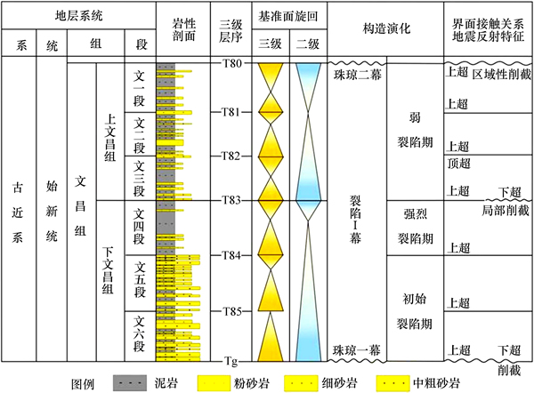 珠江口盆地是我国南海最大的产油气区之一,面积约为17.5×104 km2,是在古生代及中生代复杂褶皱基底上形成的新生代含油气盆地。盆地大地构造位于华南大陆南缘,受太平洋板块、印度洋板块以及欧亚板块交汇作用影响,处于复杂的大陆动力学背景下[1]。多期构造运动造就了盆地现今“三隆三坳”的构造格局,自北向南分别为北部隆起带、北部坳陷带、中央隆起带、中部坳陷带、南部隆起带和南部坳陷带,南侧与洋盆直接接触。珠一坳陷是北部坳陷带的1个负向构造单元,走向NE,受北西向低凸起及北东向断裂体系共同控制,坳陷内部凹陷分布格局具有东西分块的特征。陆丰凹陷位于珠一坳陷的东部,面积为7 760 km2(见图1)。陆丰凹陷古近纪湖盆经历了断陷和断拗2个阶段,构成了1个完整的裂陷旋回。文昌组为断陷期沉积物,综合地震波组接触关系、测井岩性组合及沉积旋回变化等因素,将文昌组划分为6个三级层序,主力油层位于文5段,其上覆的文四段为凹陷的主力烃源岩(见图2)。
