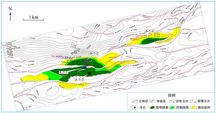 始新统文昌组沉积期为古近纪裂陷旋回的断陷期,区域性强烈拉张作用及两期重要的构造运动(珠琼运动一幕和二幕)使文昌组地层产生一组NEE—EW向断裂,断裂与储集层产状相结合,组成断层圈闭。由于遮挡的断层往往是多条,形成的圈闭类型多为复杂断块,其中,含油构造A-1断块为构造-地层,B-1为断背斜,C-1为断块,D-1为构造-地层,E-1为背斜F-1断背斜。