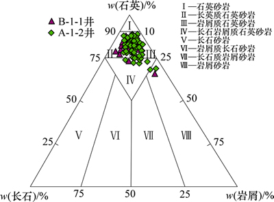 陆丰凹陷文昌组埋深普遍在3.5 km以上,主力油层甚至超过4.0 km,孔隙度为9%~15%,渗透率为(1~ 10)×10-3 μm2,整体表现为低孔低渗的特点,不发育裂缝。其优质的储层特征是保持高产的主要原因,具体表现为:1) 原生粒间孔为主,连通性好;2) 砂岩纯净,泥质杂基含量低;3) 碎屑成分成熟度、结构成熟度高;4) 颗粒粒度大,细砂岩之上具有较好的物性;5) 厚层河道砂岩,中部物性优于顶底界面物性。其中,主力油层文五段储集空间以原生粒间孔为主,占面孔率为69.2%,包括原生粒间孔和粒间溶孔;粒内溶孔占29%,见图6;孔隙度为10%~15%、渗透率主要为(3~50)×10-3 μm2;以长石质石英砂岩、岩屑质石英砂岩为主(图7),成分成熟度高;分选中等,以磨圆次棱—次圆为主,结构成熟度较高;杂基含量低,可见少量高岭石、黄铁矿、菱铁矿、方解石充填。文昌组储层整体处于中成岩A2期[4-5],据表1和表2所示储层分类标准,主要属于Ⅰ类和Ⅱ类储层,孔隙结构都以中小孔细喉型为主。