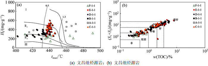 文昌组良好的生烃潜力和供烃方式决定了大中型油气田的形成与分布。文昌组强烈断陷期,北部控洼断裂强烈活动,湖平面快速上升,湖盆中心及早前处于剥蚀状态的A-1构造地区沉积了一套以深灰色泥岩为主的中深湖相沉积(图8(b))。62块泥岩地化分析结果表明:泥岩有机碳(TOC)质量分数平均为2.60%,热解生烃潜量(S1+S2)平均为12.92 mg/g,氢指数HI平均为463 mg/g,最高峰温平均为440 ℃;有机质类型为Ⅰ型,生物标志化合物显示C30 4-甲基甾烷含量高,生烃母质主要为低等水生生物和微生物,陆源母质较少,属于很好烃源岩。