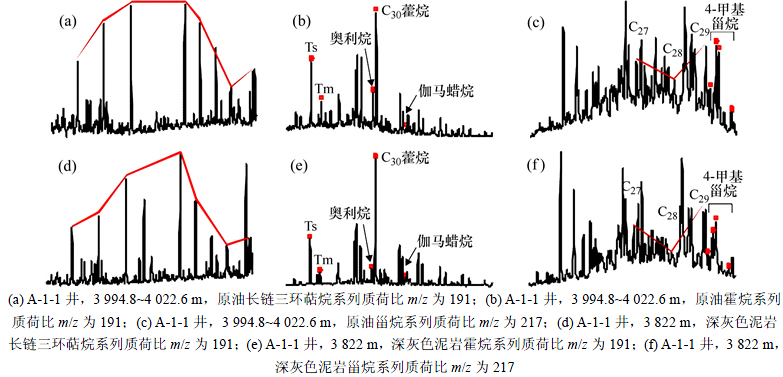 对比原油与烃源岩生物标志化合物谱图发现:两者具有较好的相似性,C30 4-甲基甾烷含量高;C27~C29规则甾烷分布呈“V”字型,树脂化合物(W,T)和奥利烷含量低;长链三环萜烷系列呈以C23为主峰的近正态分布,伽马蜡烷含量低,C30藿烷含量高、重排甾烷含量较低为特征,Ts含量高且远比Tm的含量高(见图11),表明烃源岩形成于淡水—微咸水深湖相,水介质为还原环境,生烃母质主要为低等水生生物和微生物,陆源母质较少;A-1构造地区钻井揭示深灰色泥岩厚度为91~127 m,泥岩厚度自边缘向洼槽中心呈环带状增厚,叠前反演结果表明洼陷中心烃源岩厚度超过1 km,而烃源岩厚度超过400 m的面积为130 km2,地化模拟得到的洼陷生烃量为37.76亿t。