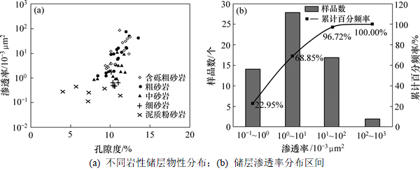 文五段主力产油层岩心实测孔隙度为7%~15%,平均孔隙度为10.5%,渗透率为(0.2~268.0)×10-3 μm2,平均渗透率为17.7×10-3 μm2,孔隙度与渗透率具有良好的正相关关系。储集层岩性与物性的关系研究表明:砂岩粒度越大,孔渗性越好,中—粗砂粒级及之上的砂岩孔渗性最优,见图12。
