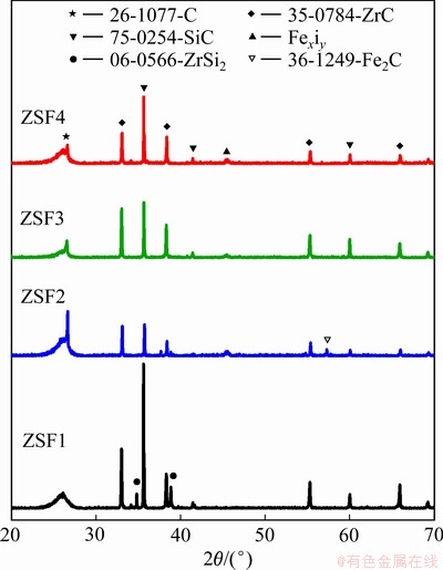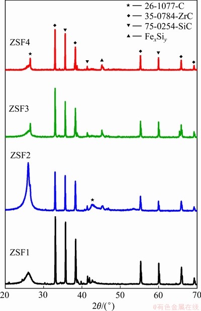 图1所示为FexSiy改性C/C-ZrC-SiC复合材料沿垂直无纬布方向的XRD谱。由图1可知,ZSF1的物相由C、ZrC和SiC组成;ZSF2、ZSF3和ZSF4的物相分别由C、ZrC、SiC和FexSiy组成。ZSF1、ZSF3和ZSF4中ZrC的衍射峰强度最高,而ZSF2中C的衍射峰强度最高。随着熔渗母料中Fe含量的升高,ZrC和SiC的衍射峰强度均呈现先降低后升高的趋势。
