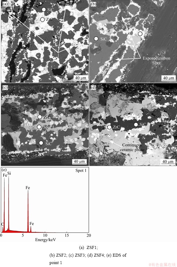 图2所示为FexSiy改性C/C-ZrC-SiC复合材料沿垂直无纬布方向的微观形貌。由图2可知,4种样品均出现白色相、浅黑色相和深黑色相。结合能谱显示,白色相由元素Zr和C组成,浅黑色相由元素Si和C组成,深黑色相由元素C组成。结合XRD谱可知,白色相为ZrC,浅黑色相为SiC,深黑色相为基体碳纤维束。由图2(b)~(d)可知,ZSF2、ZSF3和ZSF4还夹杂着灰色陶瓷相,独立于SiC和ZrC之间,而ZSF1中不存在该相(见图2(a))。对图2(c)中灰色相(Point 1)进行能谱分析发现,该相由元素Fe、Si和C组成。XRD谱中并未检测出同时包含Fe、Si、C三种元素的物相的衍射峰,仅存在FexSiy的衍射峰,因此灰色相可能为FexSiy与C或SiC的固溶相。随着Fe含量的升高,FexSiyC固溶相的面积呈现增大的趋势,证明FexSiy的含量随Fe含量的增加而升高。ZSF4中FexSiyC固溶相的分布较为连续,其分布面积相比本样品中SiC相的面积大,沿纤维束方向该相的最大长度超过200 μm。