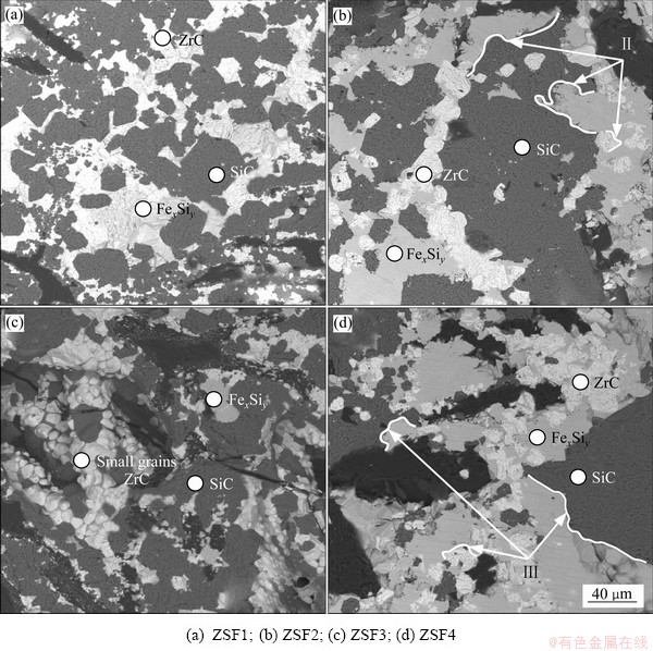 但随着Fe含量的继续升高,大量的Fe与Zr发生反应,熔渗体系主要以低熔点的FeZr2和FexSiy熔体进入C/C基体并发生反应,在复合材料中形成富Fe相包裹ZrC的形貌(见图2(d)和图4(d))。由于ZrC在Fe熔体中溶解度较小,ZrC将优先在FexSiyC中析出,并呈现“团粒型”分布[28]。