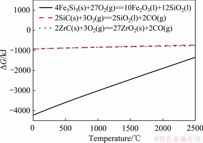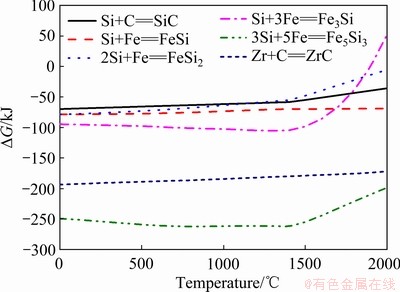 图5所示为Zr-Si-Fe-C体系部分反应式吉布斯自由能随温度变化曲线。