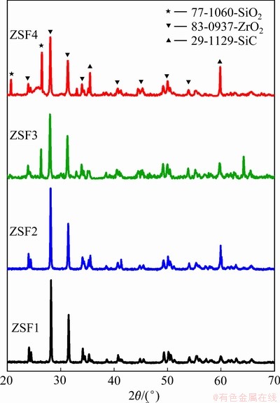 图7所示为FexSiy改性C/C-ZrC-SiC复合材料沿垂直无纬布方向烧蚀表面的XRD谱。ZSF1的烧蚀表面仅能检测出ZrO2相;ZSF2的烧蚀表面能同时检测出ZrO2和SiC相;而ZSF3和ZSF4的烧蚀表面的除了上述两种物相外,还能检测出SiO2相。