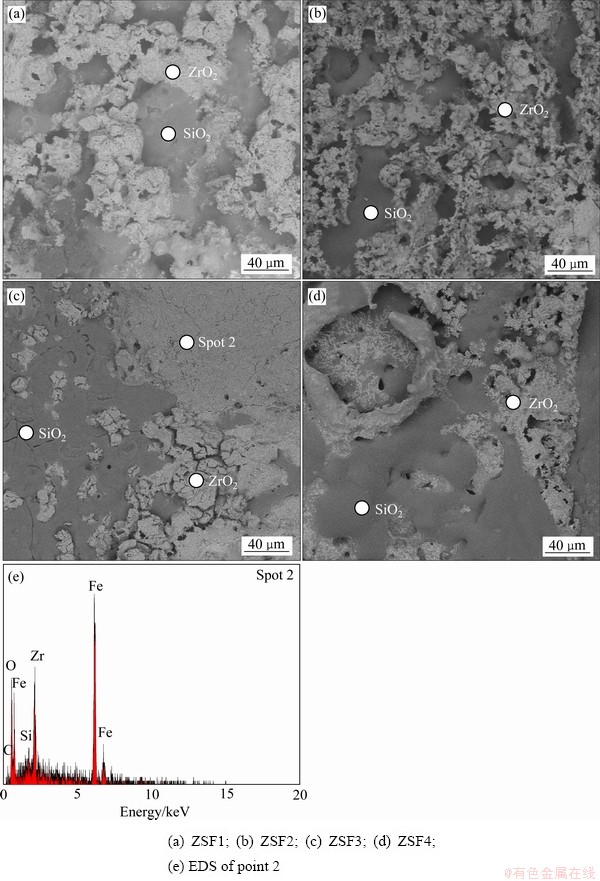 图8所示为不同Fe含量的FexSiy改性C/C-ZrC-SiC复合材料烧蚀中心区表面的微观形貌。如图8(a)和(b)所示,ZSF1和ZSF2烧蚀中心区的氧化物主要由白色疏松ZrO2和灰色SiO2组成。ZrO2主要起到耐烧蚀骨架作用,防止SiO2熔体过度流失及被剥蚀。但可以观察到,ZSF2中ZrO2十分破碎,表面SiO2剩余量少。结合XRD分析可知,ZSF2表面氧化层剥蚀最为严重,烧蚀后内部部分碳化物裸露。随着Fe含量逐渐增加,如图8(c)和(d)所示,烧蚀中心区孔隙逐渐减少,锆基陶瓷逐渐致密化,ZSF4表面形成了致密的ZrFeSiO相(见图8(e))。