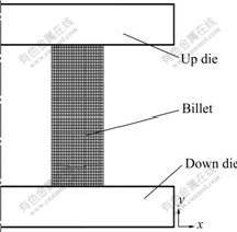 考虑到圆环压缩变形的轴对称性,采用有限元软件DEFORMTM-2D对成形过程进行模拟,同时为了合理地将模型简化又提高计算精度,仅取坯料子午面的一半作为模拟研究对象,有限元模型如图1所示。