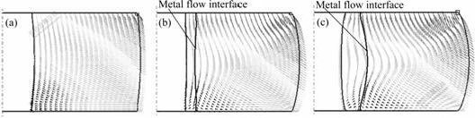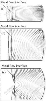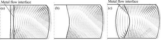 Fig.2 Distribution of velocity field and metal flow interface with different ratios of height to diameter: (a) 0.5; (b) 1.0; (c) 1.5