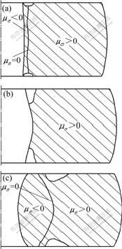 由图6(a)可以看到,当摩擦因子较小时变形体内的材料均能满足塑性屈服条件而发生变形,各处材料的应变类型为均一的压缩类,即沿轴向呈缩短而沿环向和径向呈伸长趋势;随着摩擦因子的增大,内壁角部出现小部分难变形的区域(见图6(b)),靠近圆环内侧的小段距离内罗德系数为负值分布,由此可知,该区内材料所处应变类型为伸长类,即沿径向呈伸长而沿轴向和环向呈缩短趋势;当摩擦因子继续增大时(见图6(b)),罗德系数零值线及难变形区的位置均向外发生了偏移,即处于伸长类材料的范围相对扩大而处于压缩类变形的区域则相对缩小。