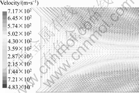 图4所示为导液管顶端回流区的速度矢量图。高速气流部分通过滞点前端进入回流区,其他则沿流场轴线向下运动。进入回流区内的气体,由于轴线方向存在一个向上的压力梯度,因而气流沿轴线向导液管顶端方向流动。气流首先加速达到最大值,然后逐渐减速。当接近导液管顶端时,转向沿锥顶径向流动,如图4所示。在导液管锥顶边缘,气流与音速边界接触时,一部分气流受到向内的挤压而向下流动,并限制在音速边界内侧。另一部分气流则由于粘滞力的作用与高速雾化气流汇合。在回流区内部,湍流层分离了向下和向上运动的气流。