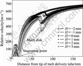 与轴线上压强变化曲线相对应的速度变化曲线如图6所示。由图6可见,回流区内滞点速度为零。由于滞止压强与回流区内轴线上其他压强之间存在一个压强梯度,则轴线上气流速度首先增大(因为与X轴正方向相反,表现为负值),达到最大值后,逐渐减小,在导液管顶端又变为0。当远离滞点沿X轴正方向运动时,雾化气流逐渐加速。由于马赫碟的出现,使气流速度突降。由此可知,随着突出长度的增加,马赫碟处气流速度下降加快。穿过马赫碟后,气流继续膨胀加速。当距离导液管顶端200 mm时,其流速逐渐达到稳定值。随着H的变化,气流的稳定值在644~ 695 m/s之间变化。