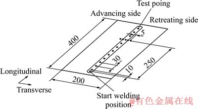 板材焊接后,待焊缝冷却至室温后采用X射线衍射法测量残余应力。测量残余应力的X射线衍射仪为IXRD型便携式残余应力测试仪。对沿焊缝间隔30 mm取12个不同位置、距离起焊处250 mm垂直焊缝方向间隔5 mm的5个位置进行了测量,测量位置如图3所示。由于试件厚度与长度和宽度相比较小,因此整个试件近似为平面应力状态,而且法向残余应力很小,与纵向残余应力和横向残余应力相比可以忽略不计。试验对每个测量点均测量了纵向残余应力和横向残余应力。