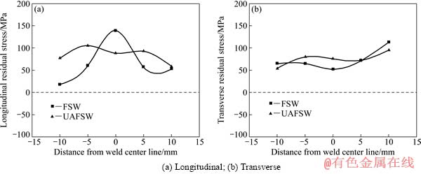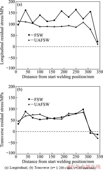 Fig. 4 Comparison of residual stresses of UAFSW and FSW obtained along weld line