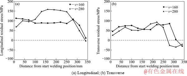 2) 在搅拌头转速相同下,提高焊接速度,纵向残余应力也随之增大;但对横向残余应力影响很小。