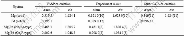 The lattice parameters of hcp Mg, fcc Pd, Mg3Pd of Cu3P-type and Na3As-type structure were firstly calculated from the minimized total energy, and the obtained results are listed in Table 1. It can be found that the present lattice parameters a and c/a of hcp Mg are 0.319 5 nm and 1.624 1, which are in good agreement with the experimental values of 0.321 nm and 1.623[10] and other GGA calculations[11]. The lattice parameter a of fcc Pd is 0.395 1 nm, which is also in good agreement with the experimental value of 0.389 nm[12] and other GGA calculations[13], showing good accuracy of the present calculations. The present first-principles calculations show that the electronic total energy of Na3As-type (there are 6 magnesium atoms and 2 atoms palladium atoms in the super cell) and Cu3P-type (there are 18 magnesium atoms and 6 atoms palladium atoms in the super cell) structure Mg3Pd are -69.390 0 eV and -22.956 6 eV, respectively. This results indicate that the Cu3P-type structure is more stable than Na3As-type structure, which is accordance with the suggestion of MAKONGO et al[8]. The calculated Mg3Pd lattice parameters (a and c/a) of Cu3P-type and Na3As-type structure are 0.802 6 nm and 1.048 8, 0.465 1 nm and 1.805 7, respectively. It can also be found the Cu3P-type and Na3As-type structure lattice parameters have the following relationship,