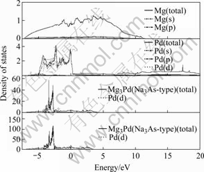 Fig.1 Total and partial density of states of hcp-Mg, fcc-Pd and Mg3Pd for Cu3P -type and Na3As -type