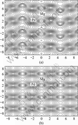 In order to further understand the microscopic mechanism of bonding in Mg3Pd alloy, charge density distributions were investigated. The charge distributions calculated on (010) plane for Cu3P-type and (100) plane for Na3As-type are shown in Fig.2(a) and Fig.2(b), respectively. It is clear that the feature of covalent bond between Mg and Pd atoms exhibits apparently, and charge distributions between Mg and Pd atoms for two types of crystal structure are very similar. Nevertheless, according to the DOS and bonding electron number mentioned above, the charge density overlapping between Mg atom and Pd atom in the Cu3P-type Mg3Pd crystal should be enhanced very slightly compared with that in the Na3As-type structure. So, the bond strength between Mg and Pd atoms Cu3P-type structure should also be increased very slightly.