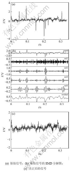 若噪声和信号混叠,则可设置硬(或软) 阈值去噪,其过程类似小波变换中的方法[8-9, 11]。硬(软)阈值的设定方法描述如下:给定信号x(t)经EMD分解后得到N个IMF, 对每一层IMF选取一合适的阈值, 并用此阈值对Ci进行截断为